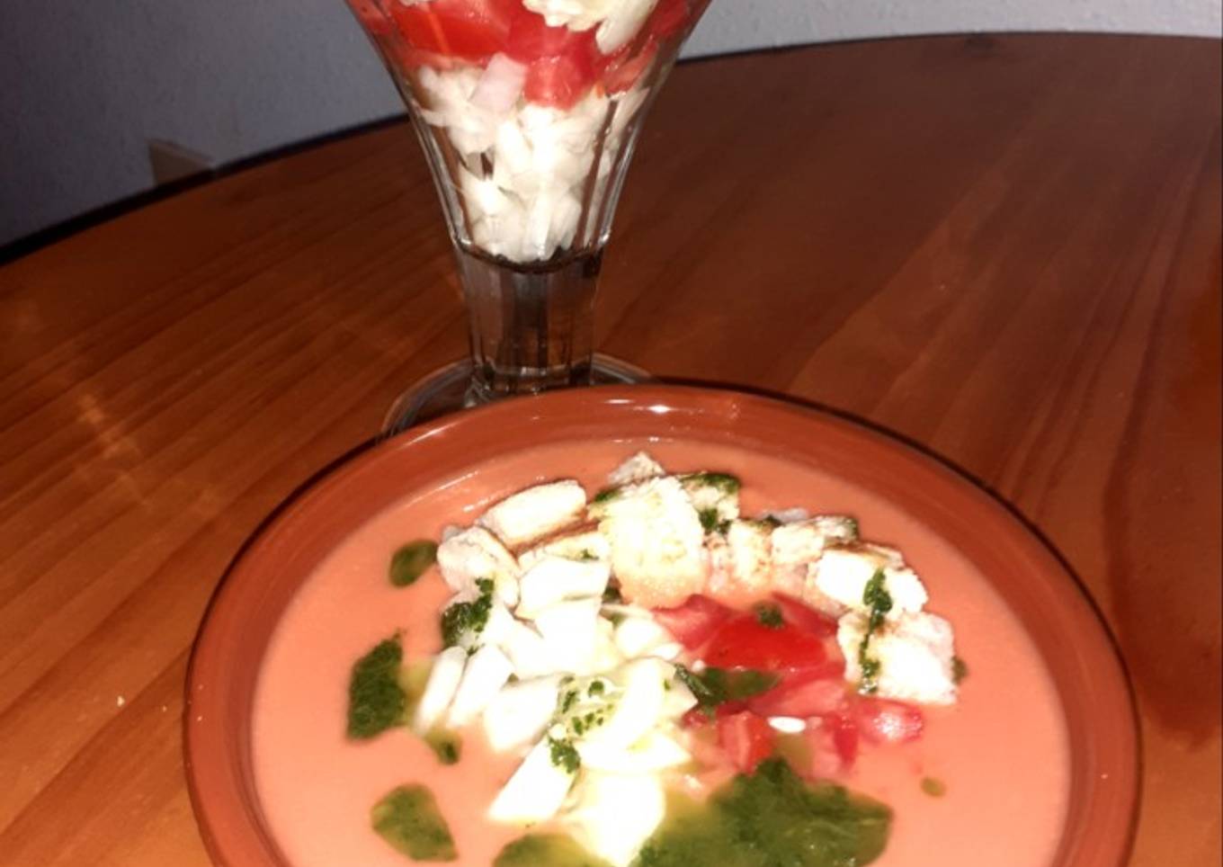 - Servir el gazpacho muy frío y decorar lo con la misma verdura utilizada, poner unas gotas del aceite preparado y el pan tostado.