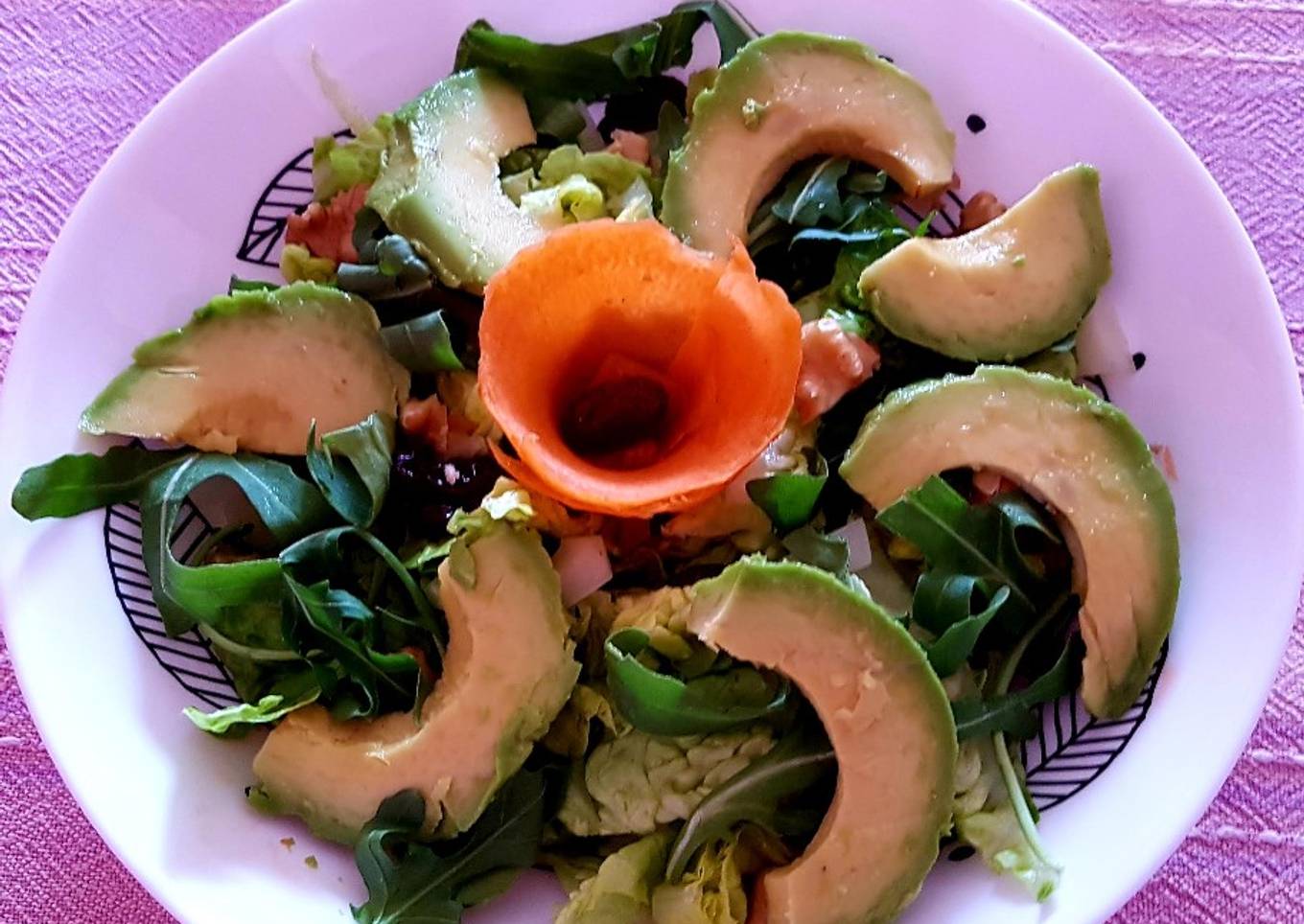 Ensalada de aguacate, rúcula, pasas, nueces y zanahoria