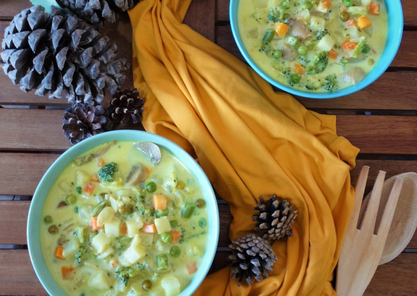 - Echamos la leche y el caldo de verduras. Dejamos reducir un poco y comprobamos que todas las verduras estén bien hechas. ¡Y listo!