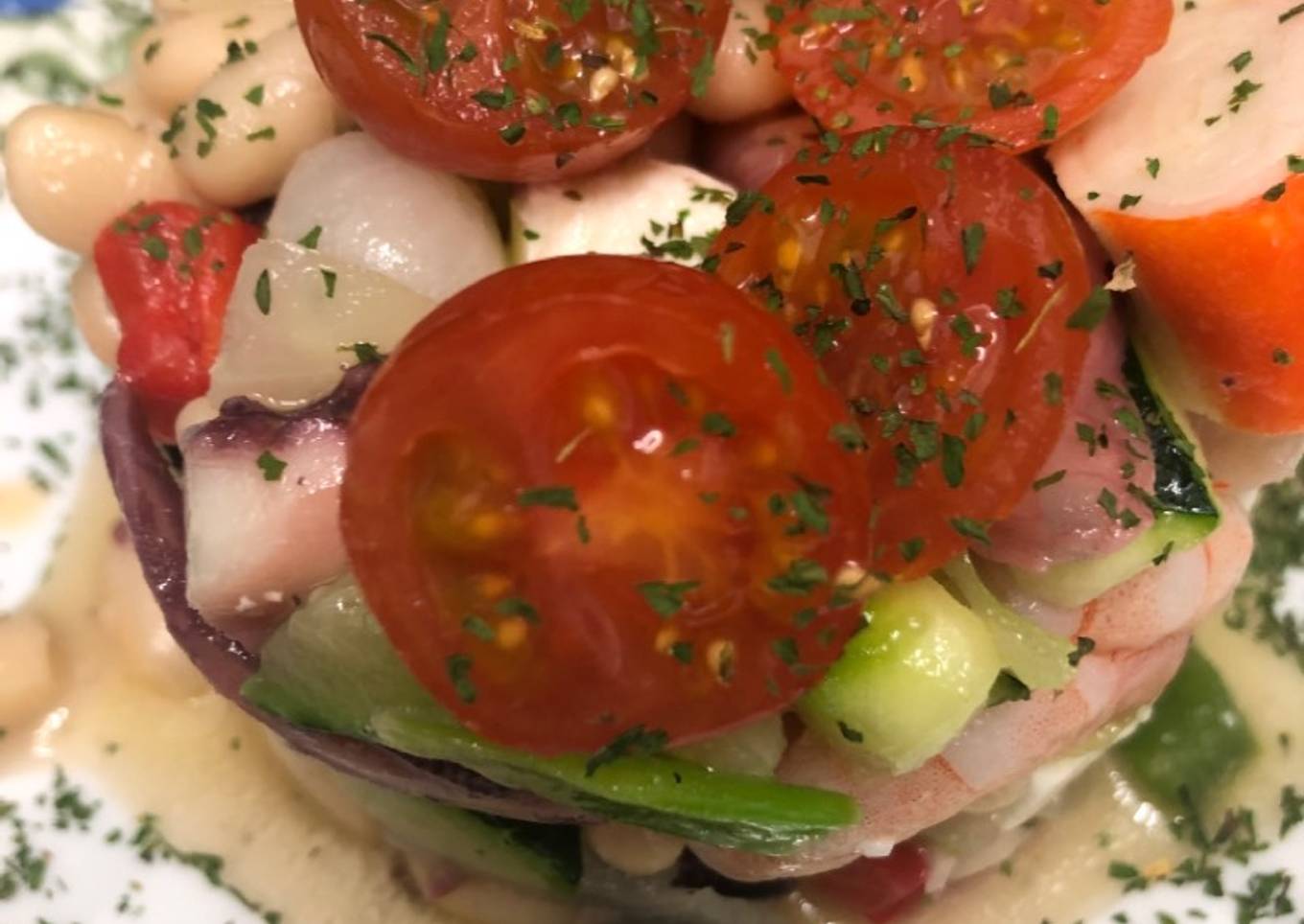 273. Ensalada de alubias y salpicón de marisco con queso feta (principal legumbres)