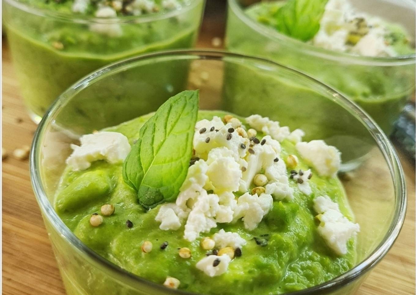 Crema fría de guisantes, queso feta y yerbabuena