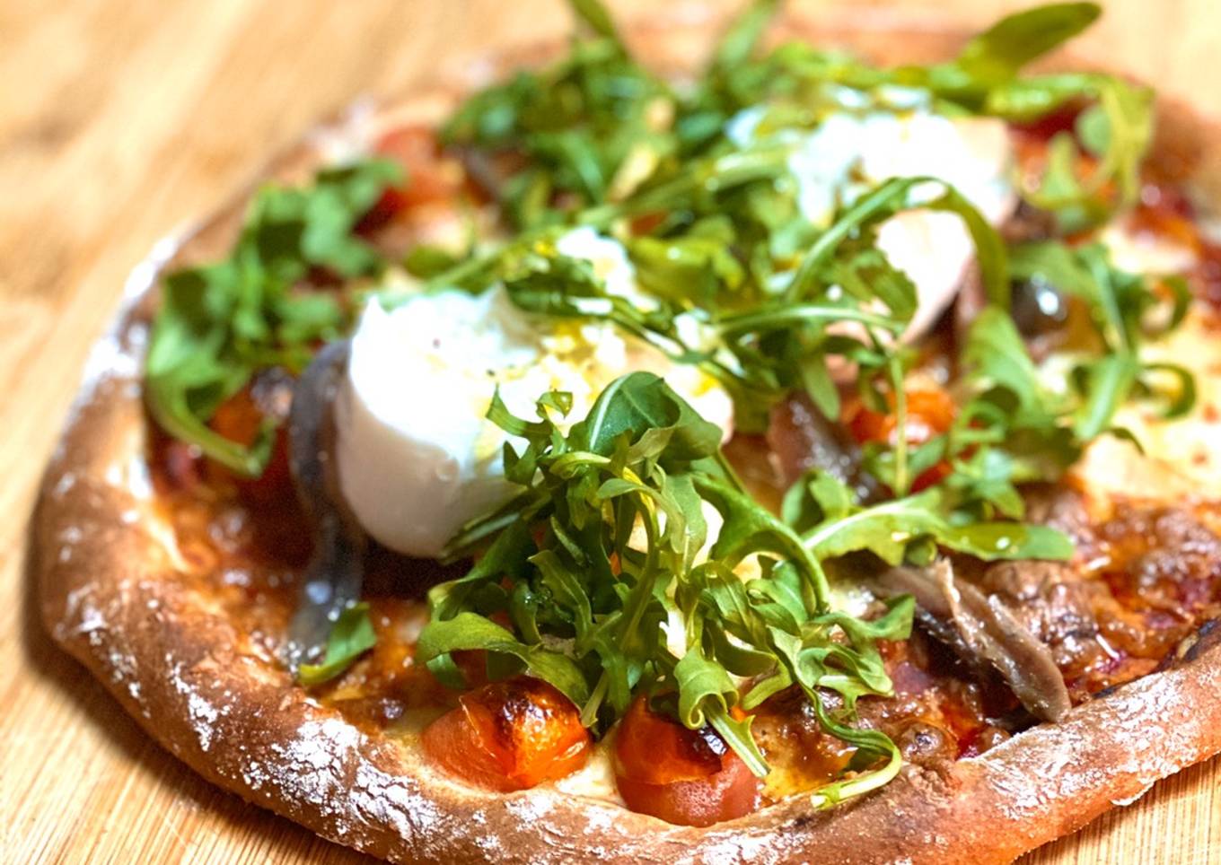 - Cuando ya la tengas al grosor que te guste pon los ingredientes que te gusten, yo puse: Pasta de tomate concentrado+tomatitos cherry+mozarella rallada+queso tipo brie. Y al horno a 200ºC unos 8-10 minutos. Al salir le puse unas anchoas, mozarella fresca light y rúcula, chorrito de aceite de oliva y a comer!