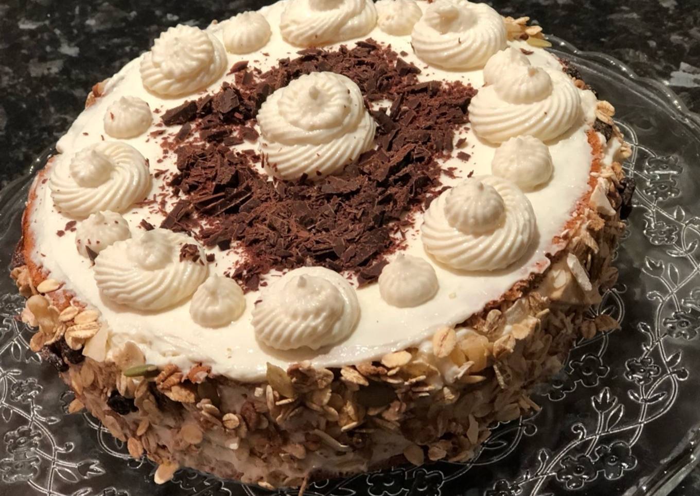 - Recubrir los bordes de la tarta (yo esta vez elegí un muesli natural) y terminar de decorar con manga pastelera. Para terminar rallar un poco de chocolate puro para decorar por encima.
