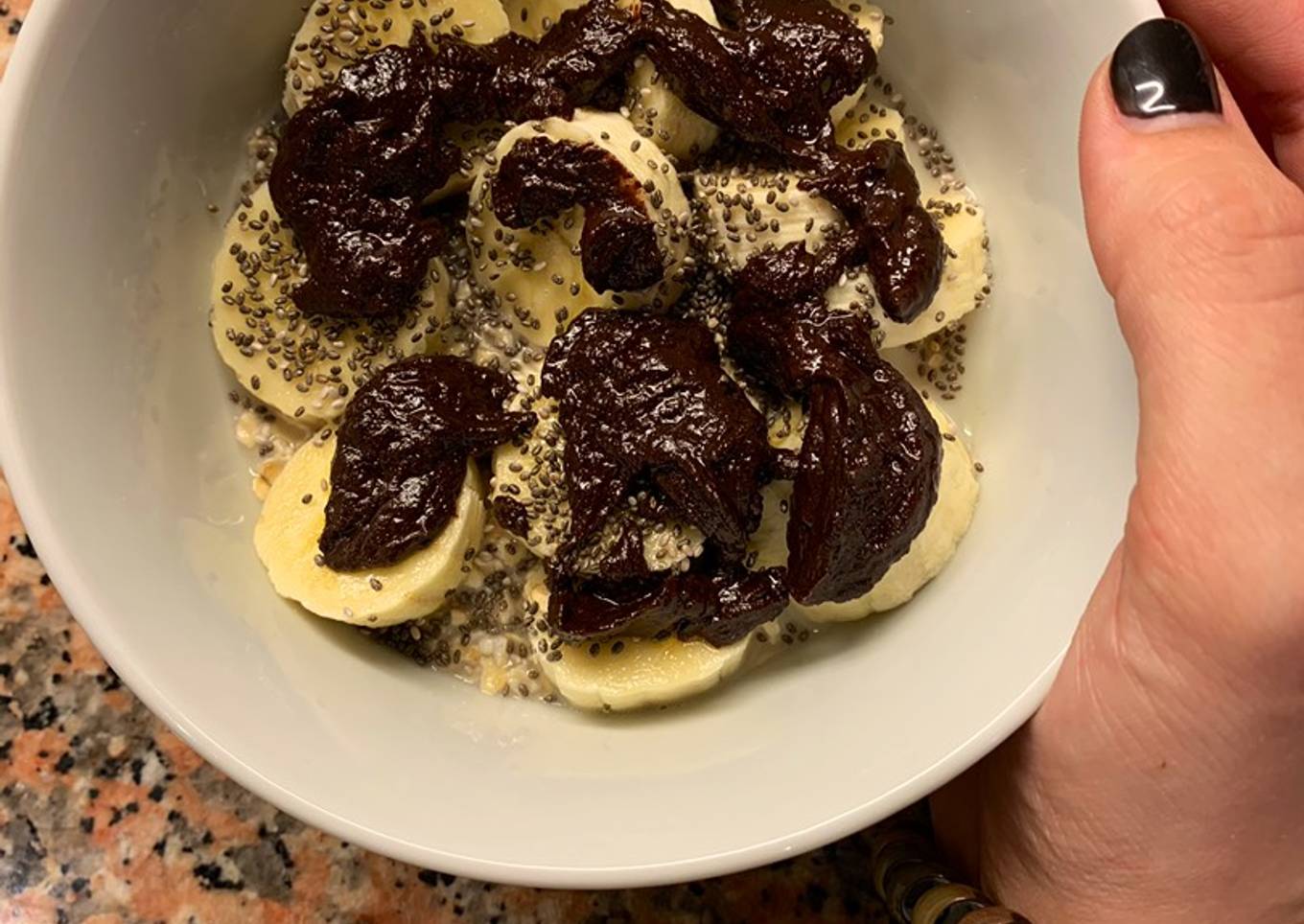 - Calentamos la onza de chocolate con un poquito de leche de avena y esparcimos por encima del plátano.