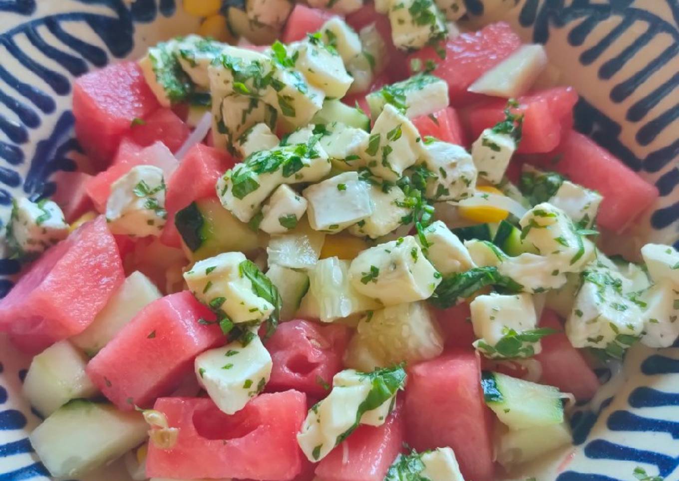 Ensalada fresca de sandía y pepino, con queso de albahaca