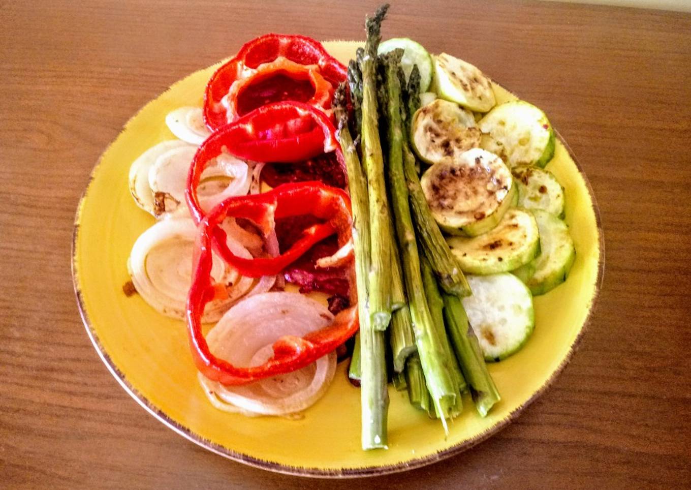 - Coloca las verduras lavadas y cortadas como en la foto principal. A los espárragos hay que quitarles la punta cortándola justo por donde hace clack en la parte trasera