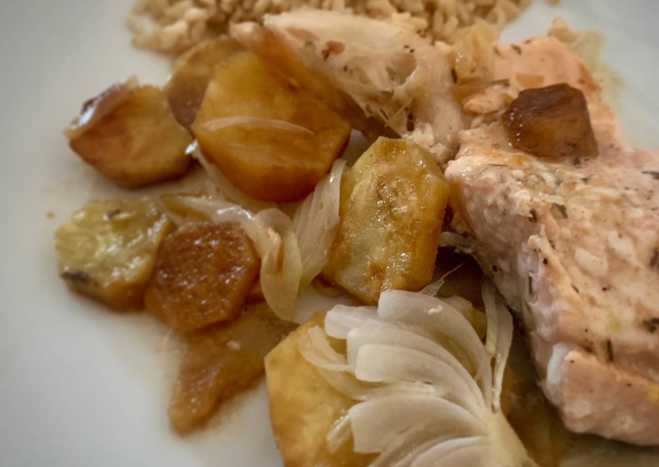 - Añadir el salmón sobre la cebolla y boniato y otros 6 minutos.