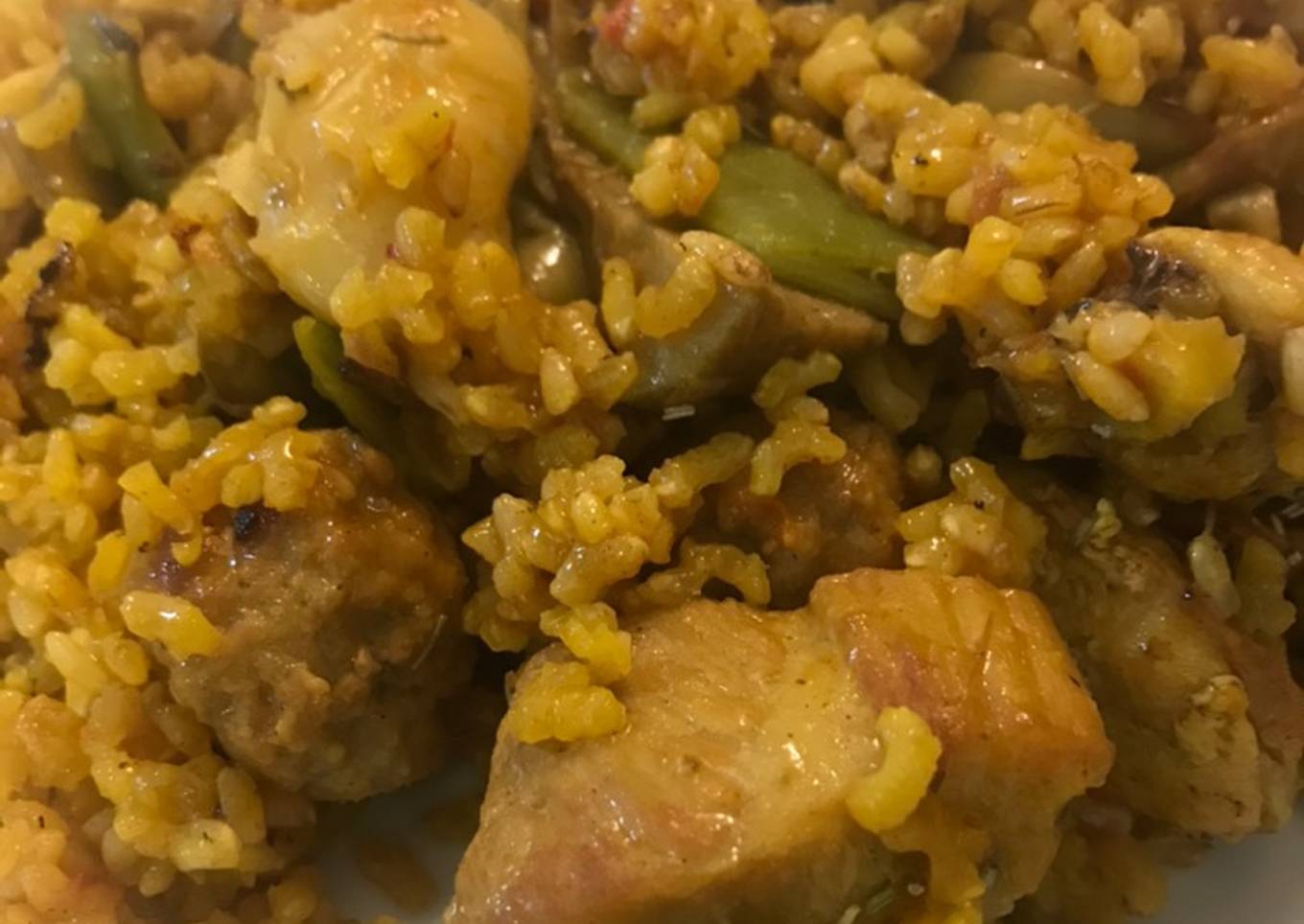 Paella Valenciana con alcachofas, albóndigas y arroz integral