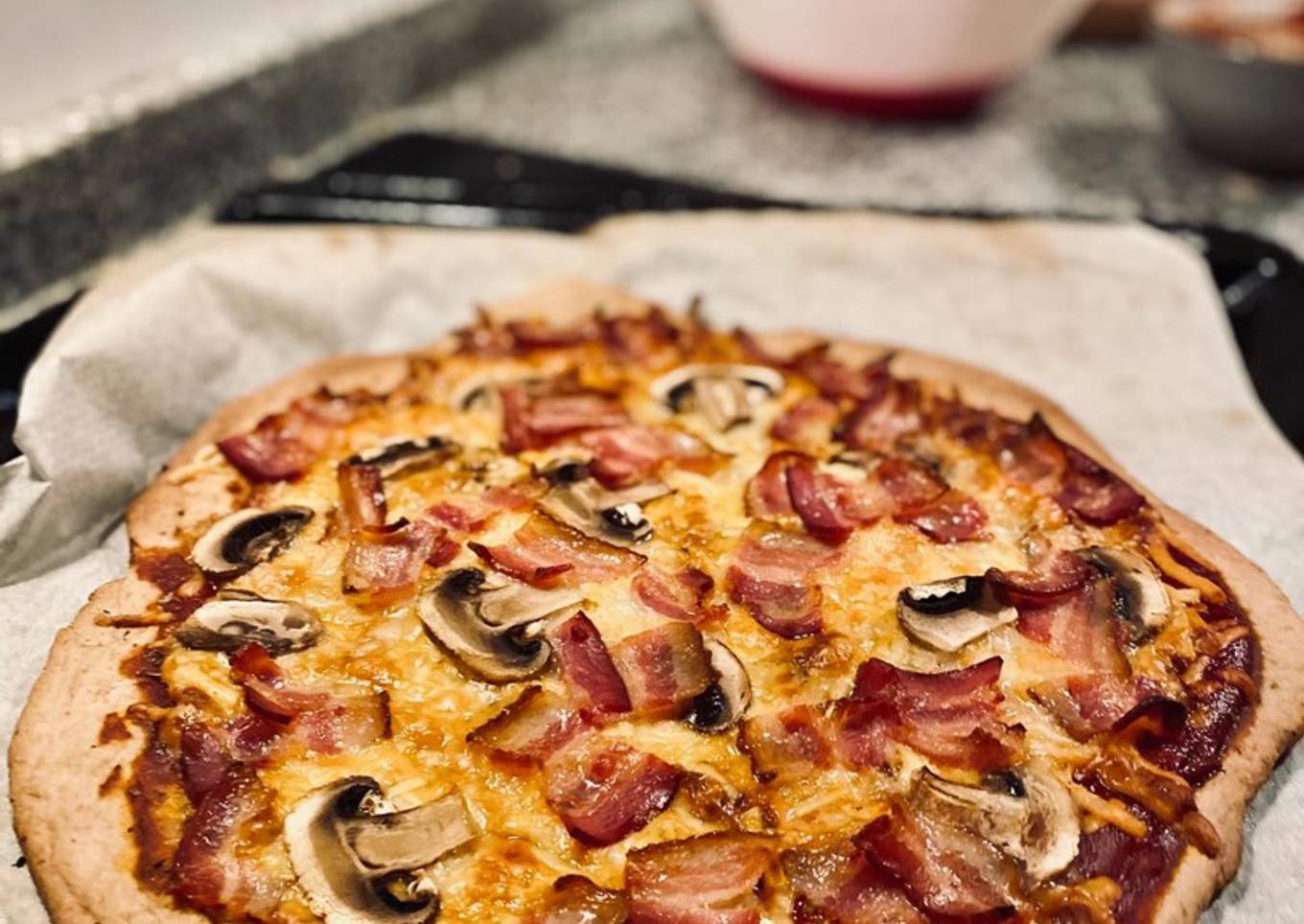 Pizza de bacon y champiñones, con masa de pizza integral de cerveza Guinness! 🍻