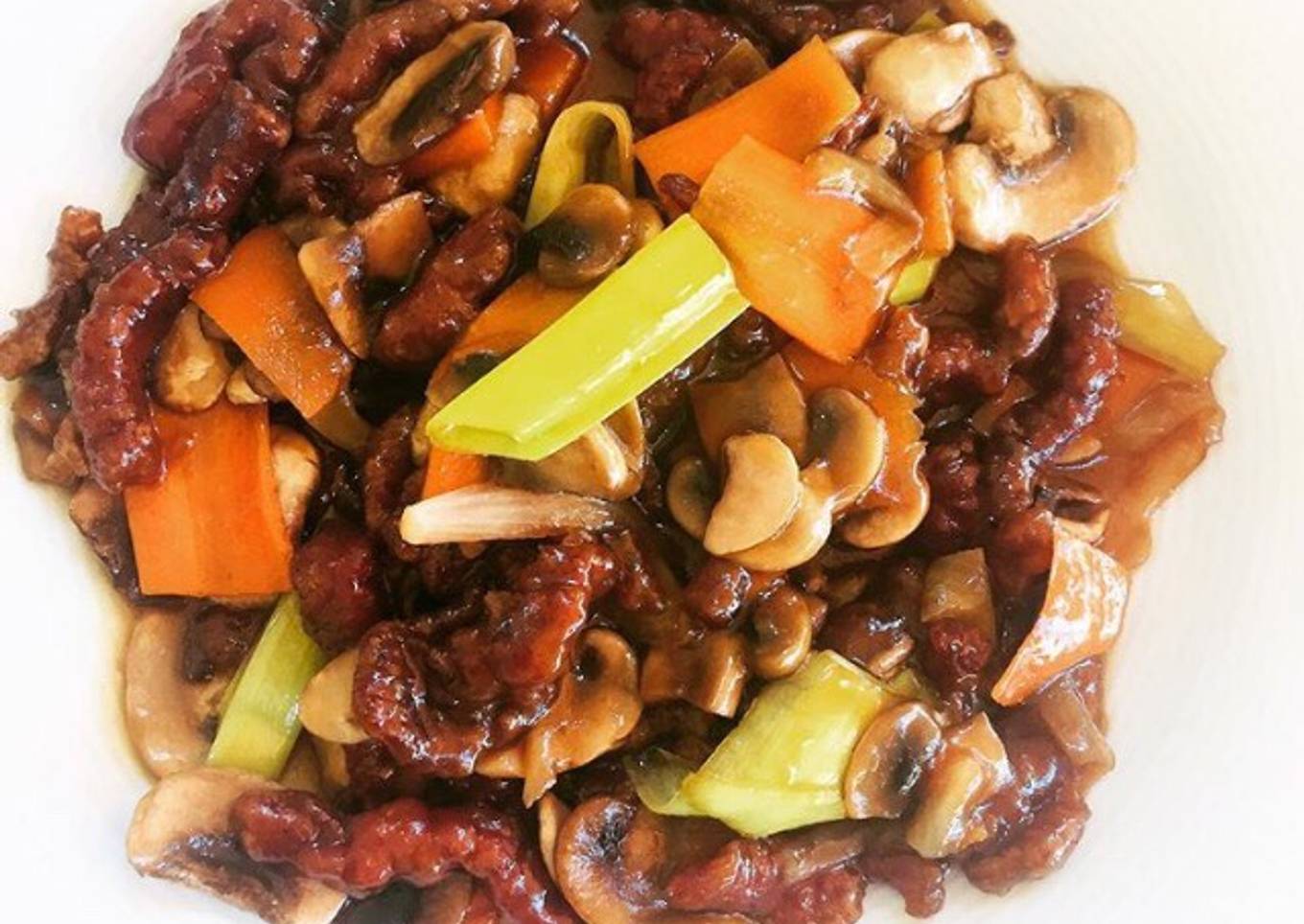 - Unimos en la misma sartén las verduras y la carne, añadimos la salsa y ponemos pimienta y jengibre. Añadimos 100 ml de agua y dejamos cocinar hasta que se absorba la salsa. Listo para servir.